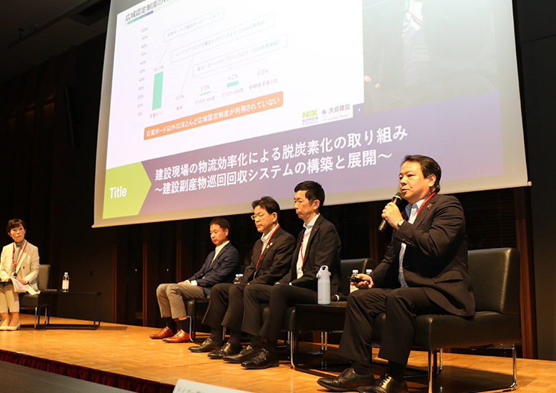 第2部では、NIPPON EXPRESSホールディングス株式会社岸田執行役員をモデレーターに、株式会社商船三井、成田国際空港株式会社、タイガー魔法瓶株式会社、大成建設株式会社の各社が脱炭素に資する事例を紹介し、パネルディスカッションを行いました。会場に集まったお客様は、実例を交えた具体的なソリューション内容に熱心に耳を傾けており、その後行われた懇親会でも活発な情報交換が行われました。